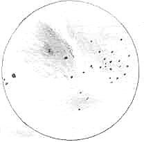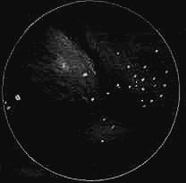 In the same constellation as the Checkmark and Trifid nebulae is the Lagoon -- visible to the naked eye as a hazy patch just off the Milky Way. It ranks as one of the best diffuse nebulae, inferior only to the Orion and possibly the Checkmark. It is very expansive with no definite borders except near the numerous dust lanes. One dark lane in particular divides the nebula in half. To the right is a sparkling open cluster.